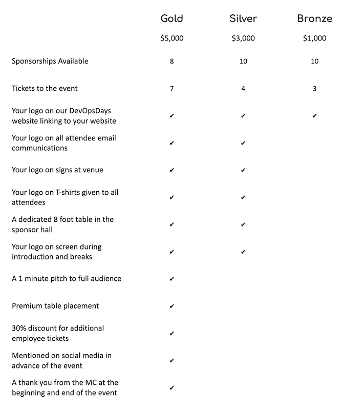 Please see our prospectus and contact us at [organizers-chattanooga-2019@devopsdays.org ] for more information on sponsoring devopsdays Chattanooga 2019.